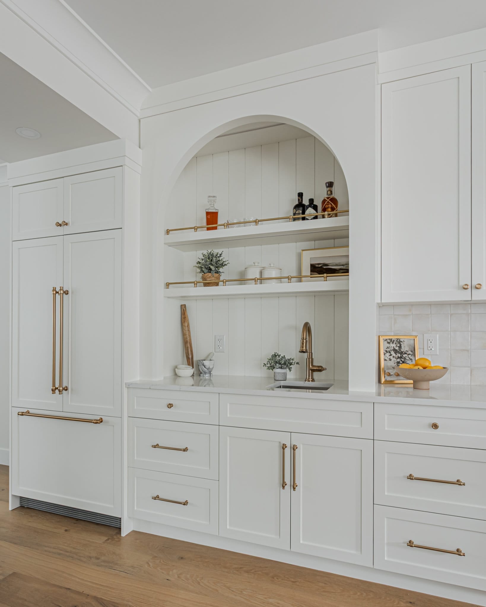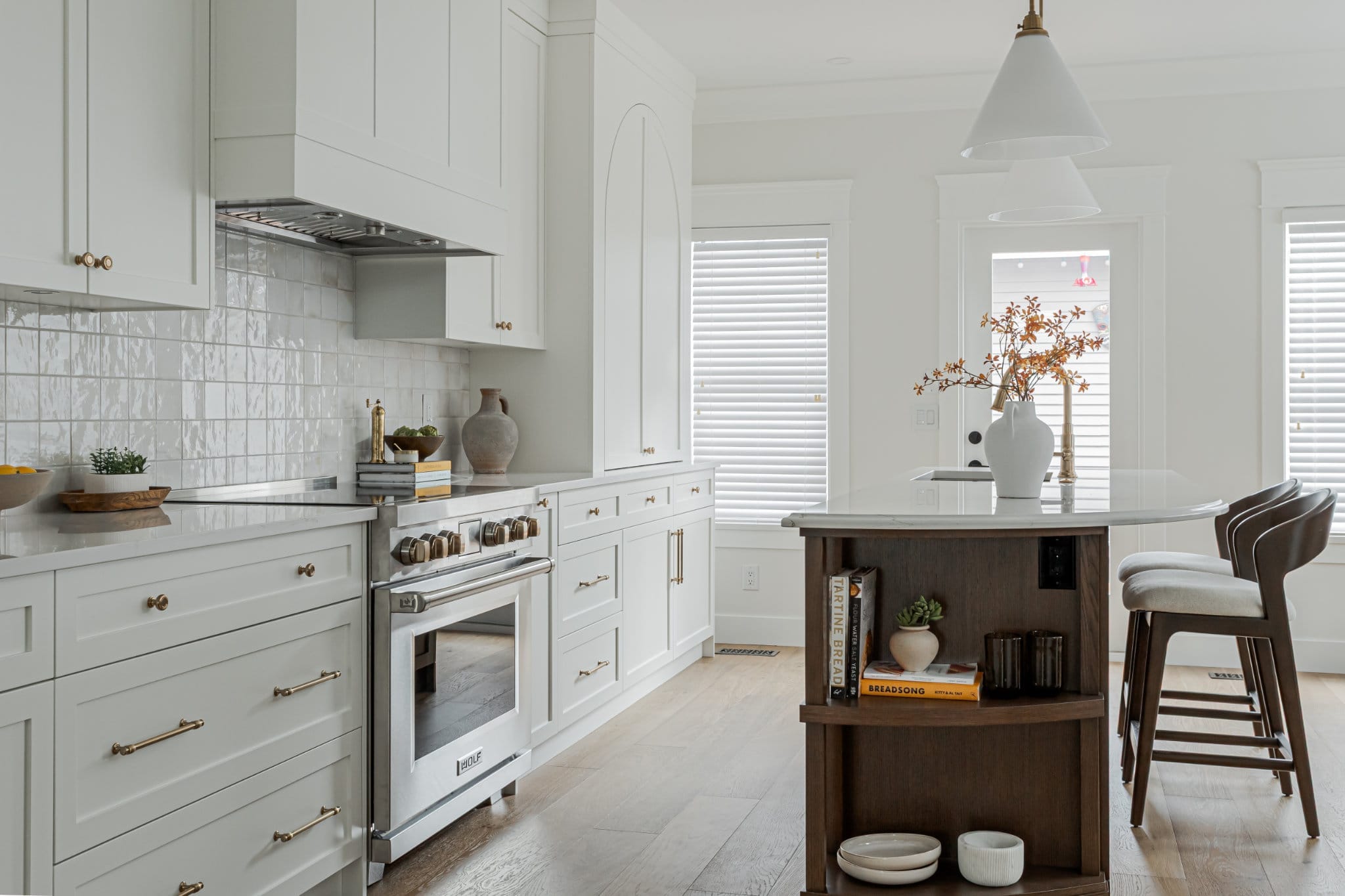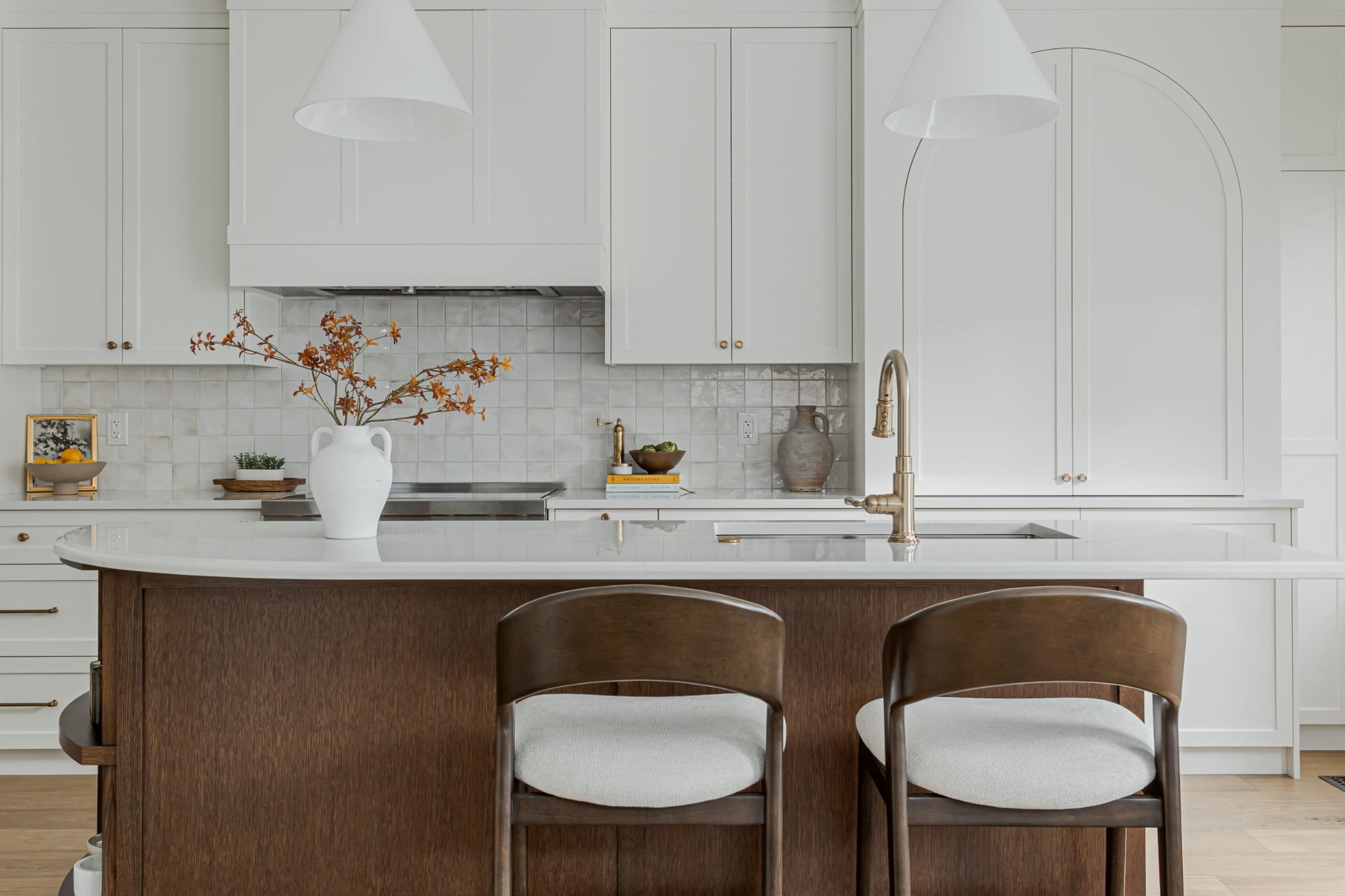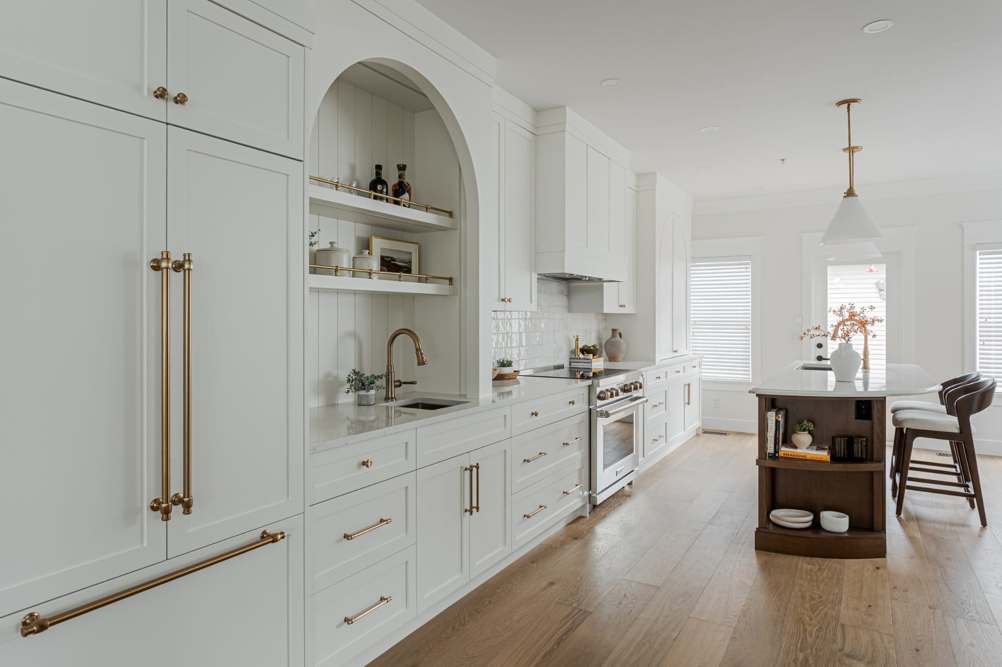 The kitchen design balances classic and contemporary elements. Painted perimeter cabinetry in a soft, warm white is paired with a custom wood island finished in an aged hickory tone, creating contrast and depth. Arched cabinet doors and carefully proportioned millwork introduce subtle architectural character, while champagne bronze hardware adds warmth without overpowering the space.