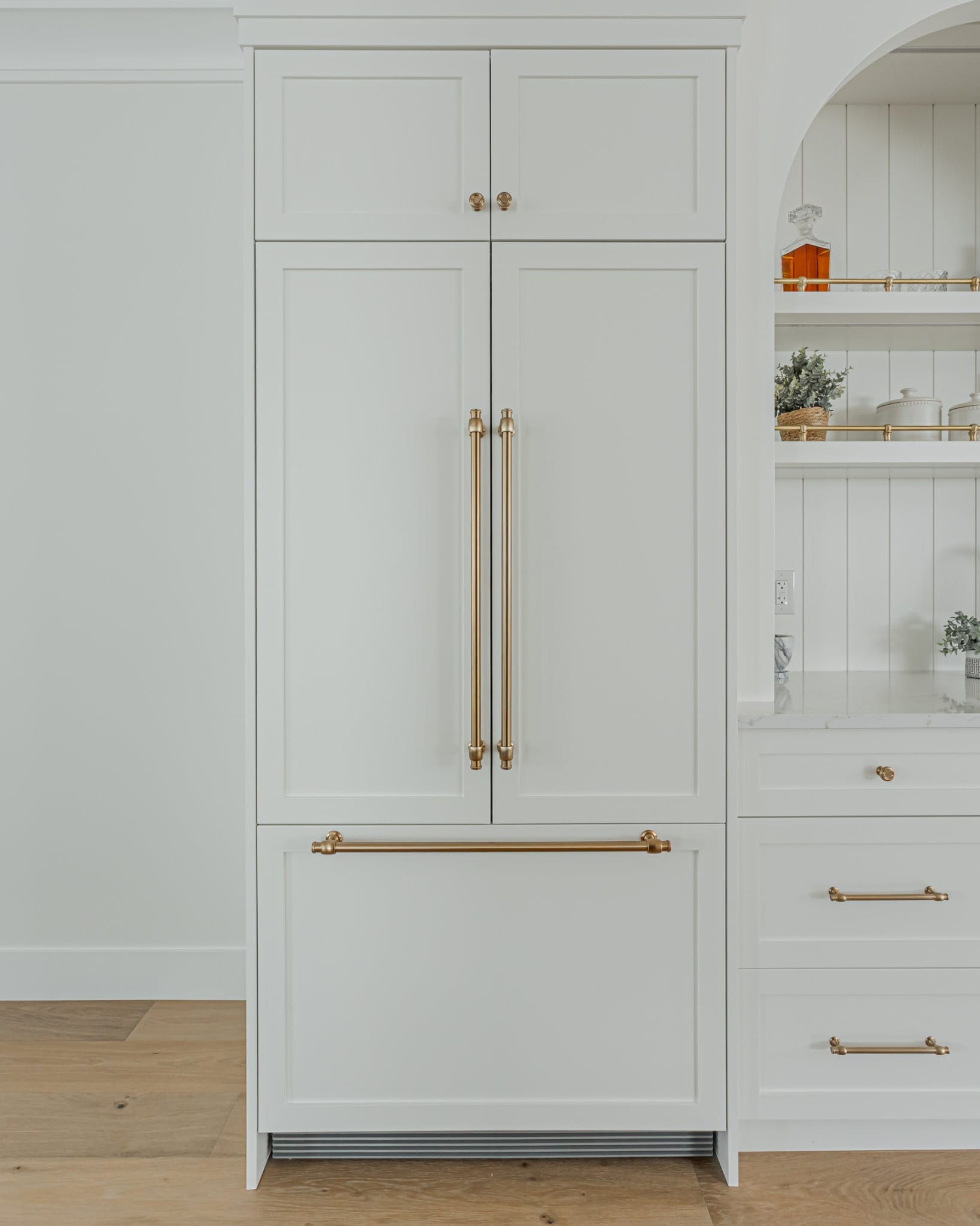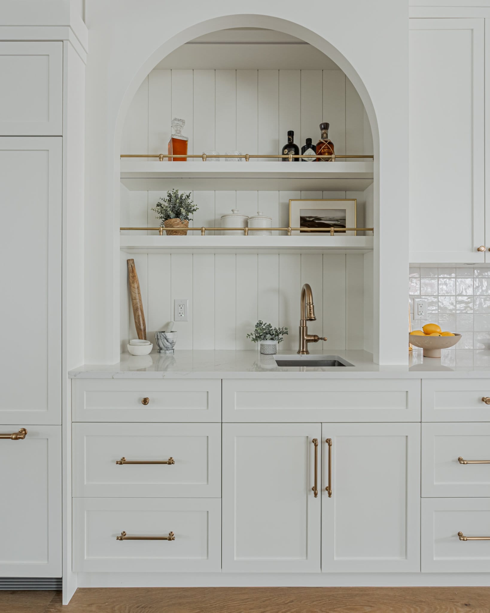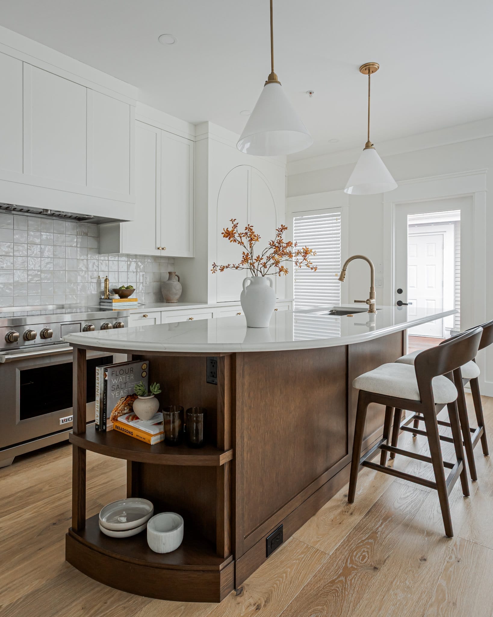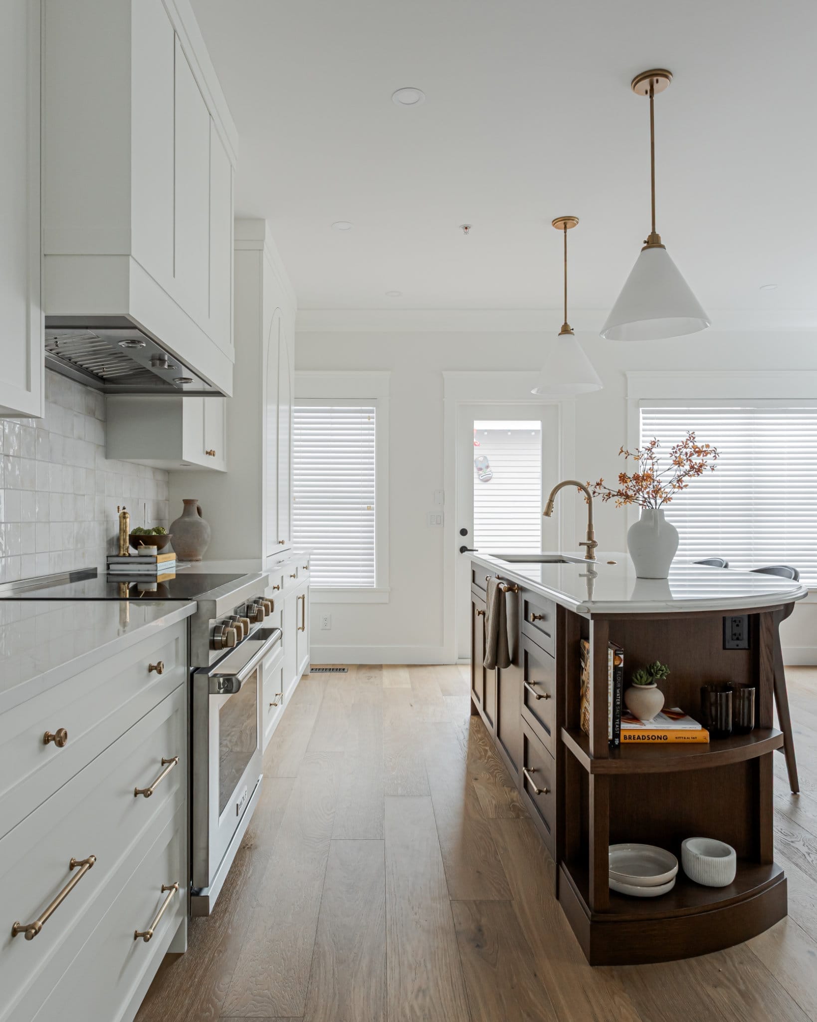 The kitchen design balances classic and contemporary elements. Painted perimeter cabinetry in a soft, warm white is paired with a custom wood island finished in an aged hickory tone, creating contrast and depth. Arched cabinet doors and carefully proportioned millwork introduce subtle architectural character, while champagne bronze hardware adds warmth without overpowering the space.