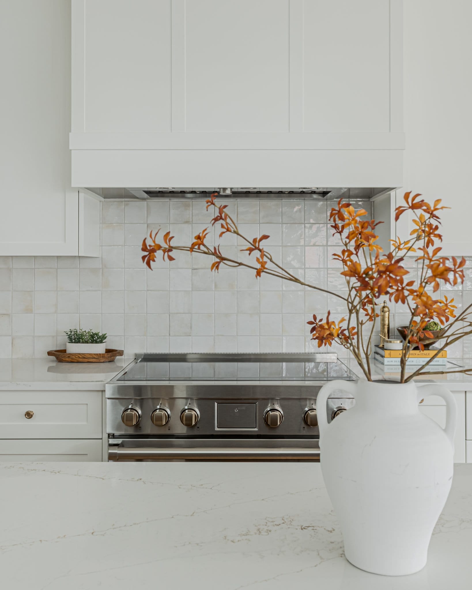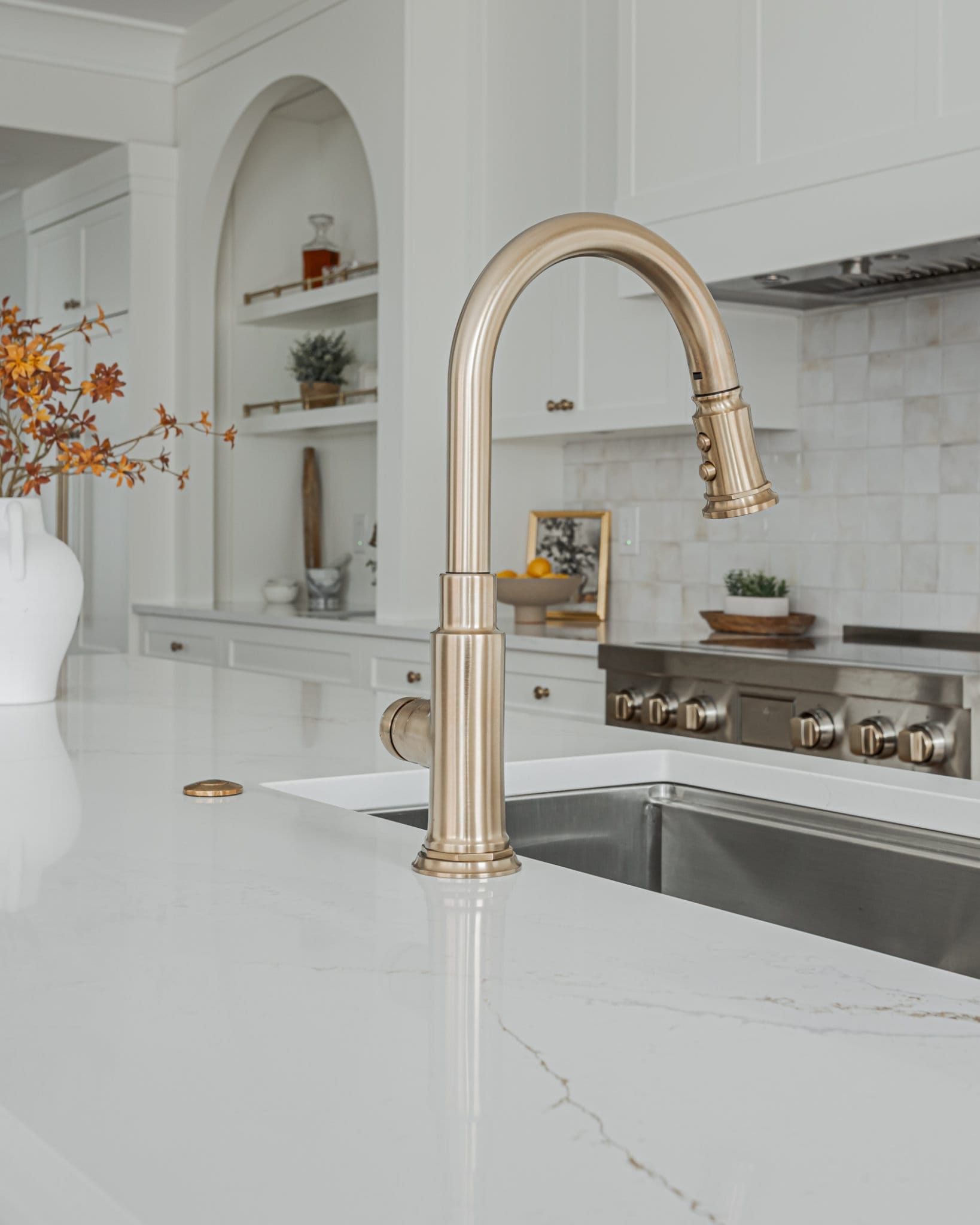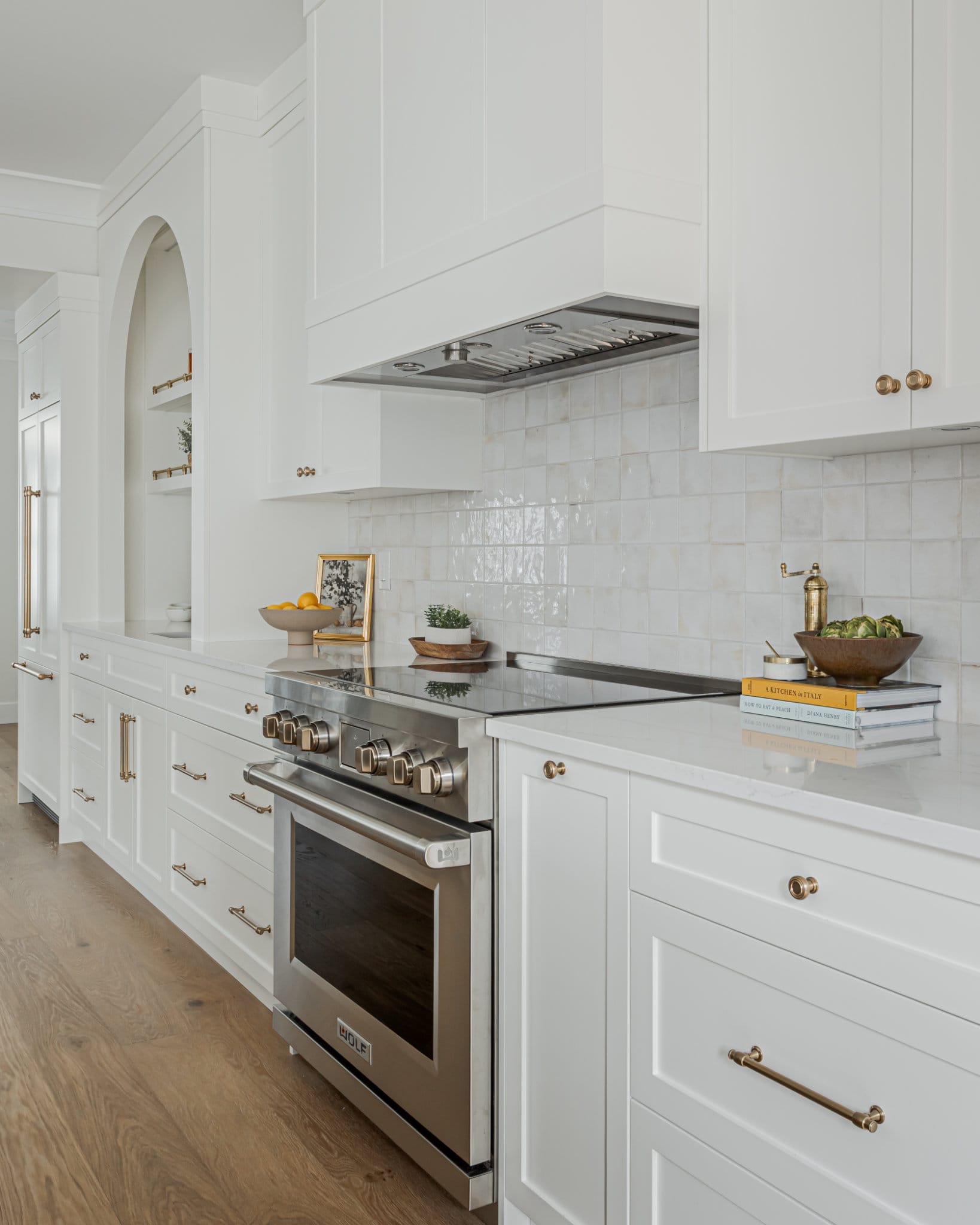 Quartz countertops in a polished finish were used throughout, with a more detailed edge profile on the island to elevate the focal point of the room. A handcrafted tile backsplash brings texture and light reflection, complementing the clean cabinetry lines and tying into the neutral palette. Integrated appliances and a concealed hood insert maintain a streamlined, uncluttered look.