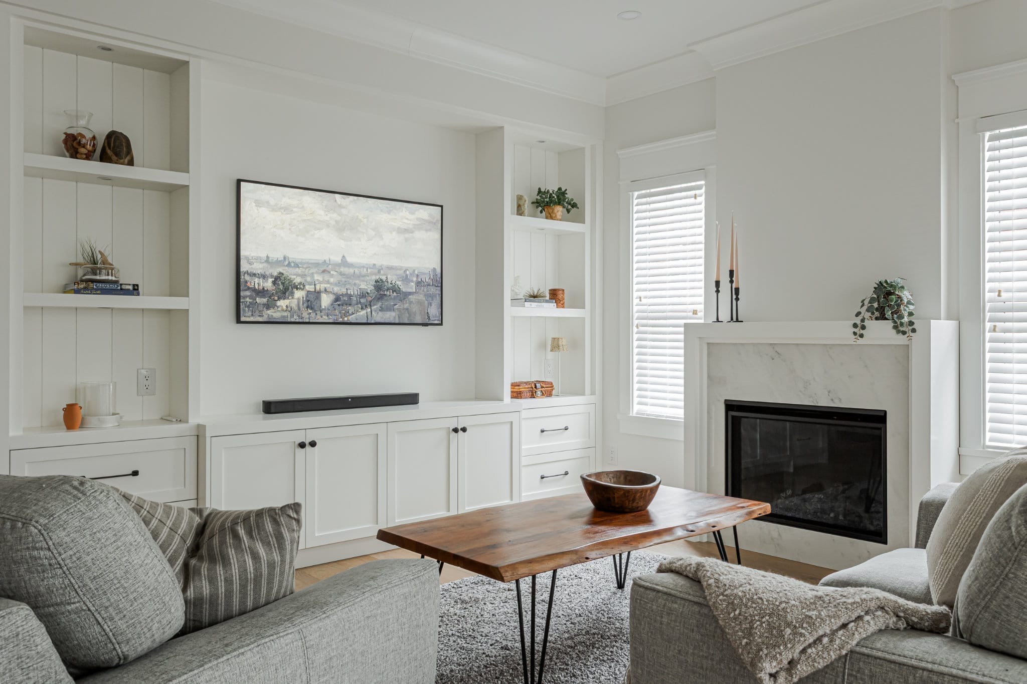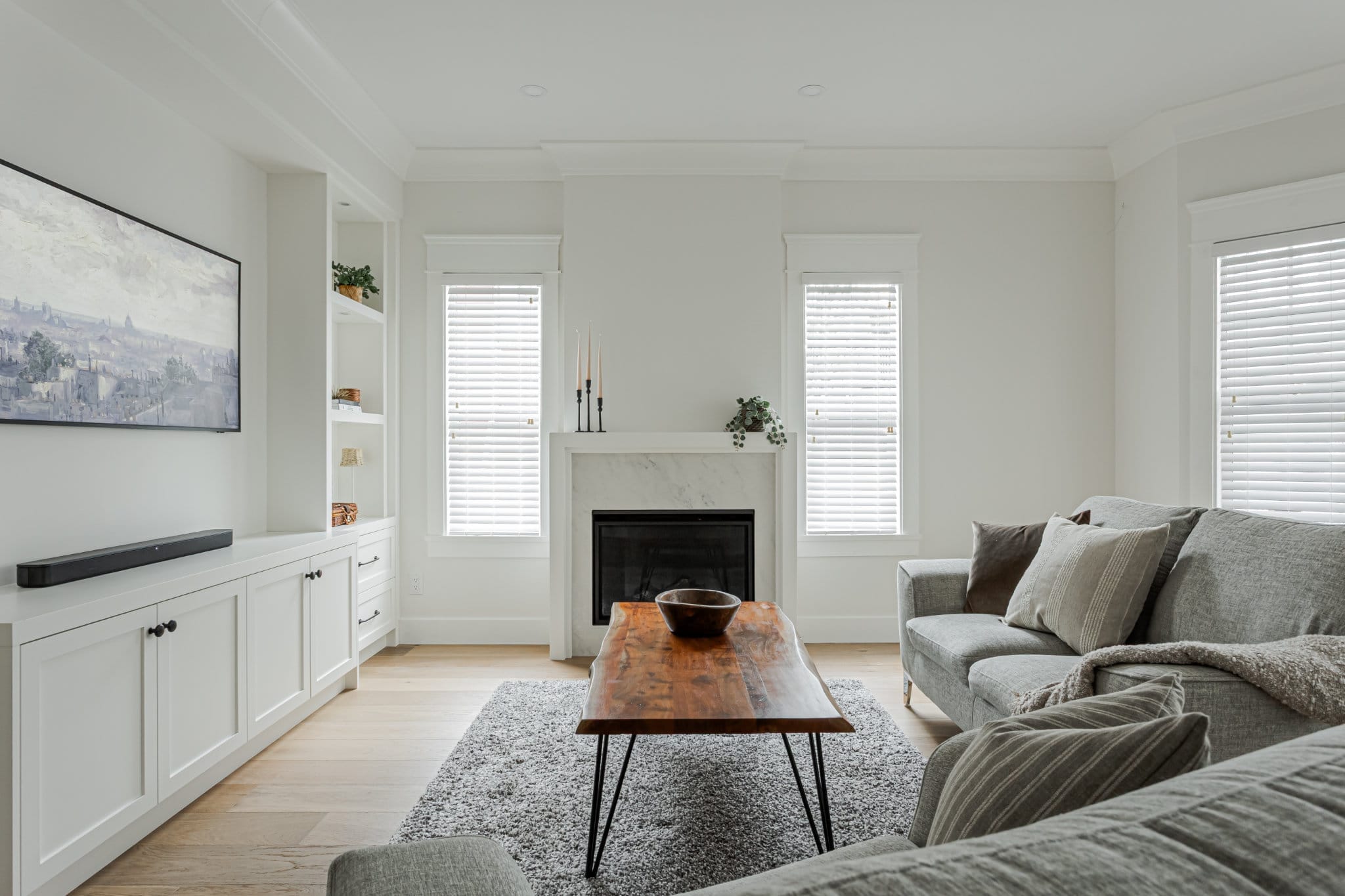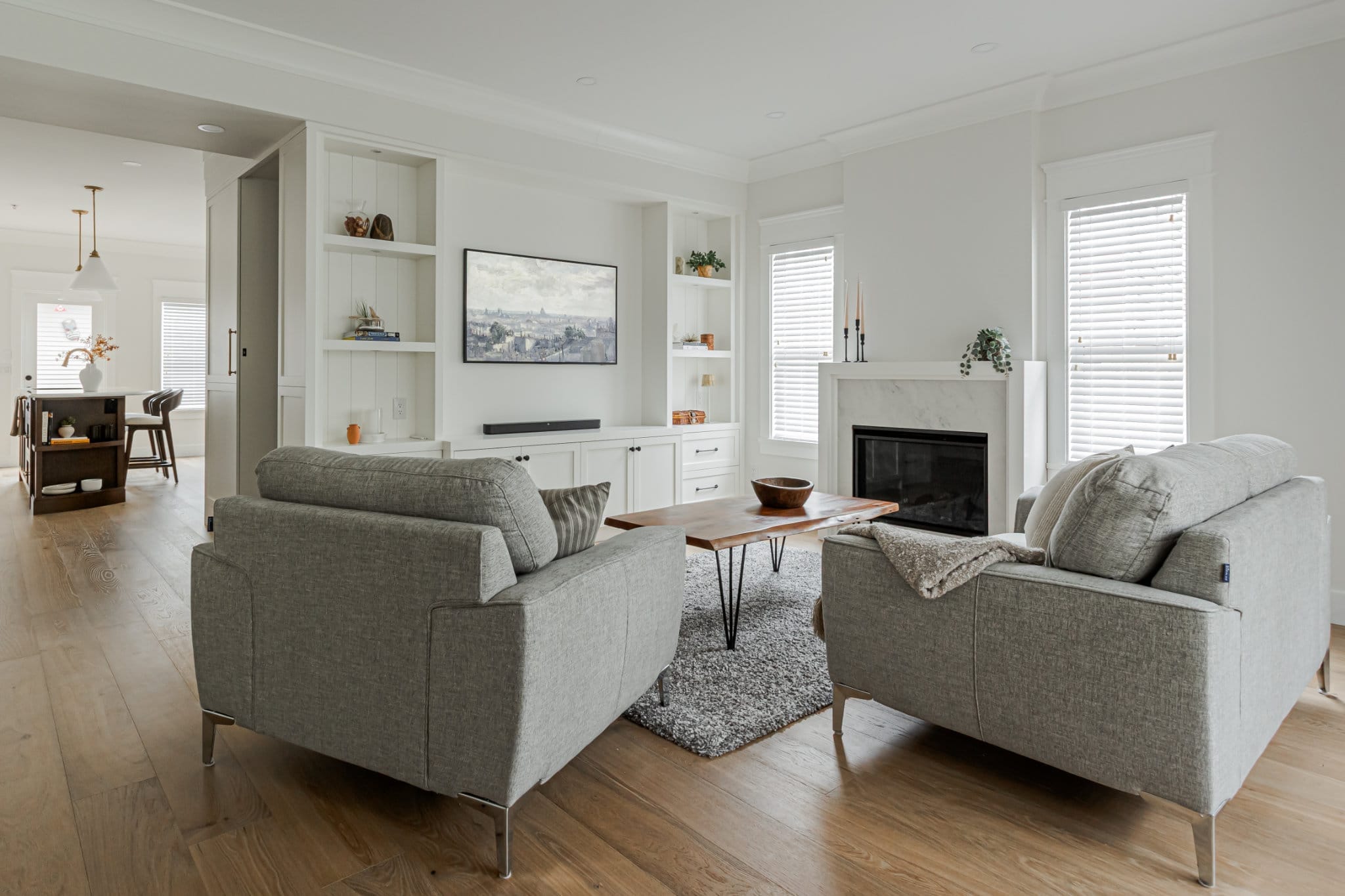 Wide-plank engineered oak flooring runs continuously throughout the main floor, visually unifying the kitchen, dining, and living spaces. In the entertainment area, custom cabinetry and a new fireplace feature were designed to feel built-in and timeless, providing both function and visual balance. The fireplace surround and millwork details echo the kitchen finishes, reinforcing cohesion across the floor plan.