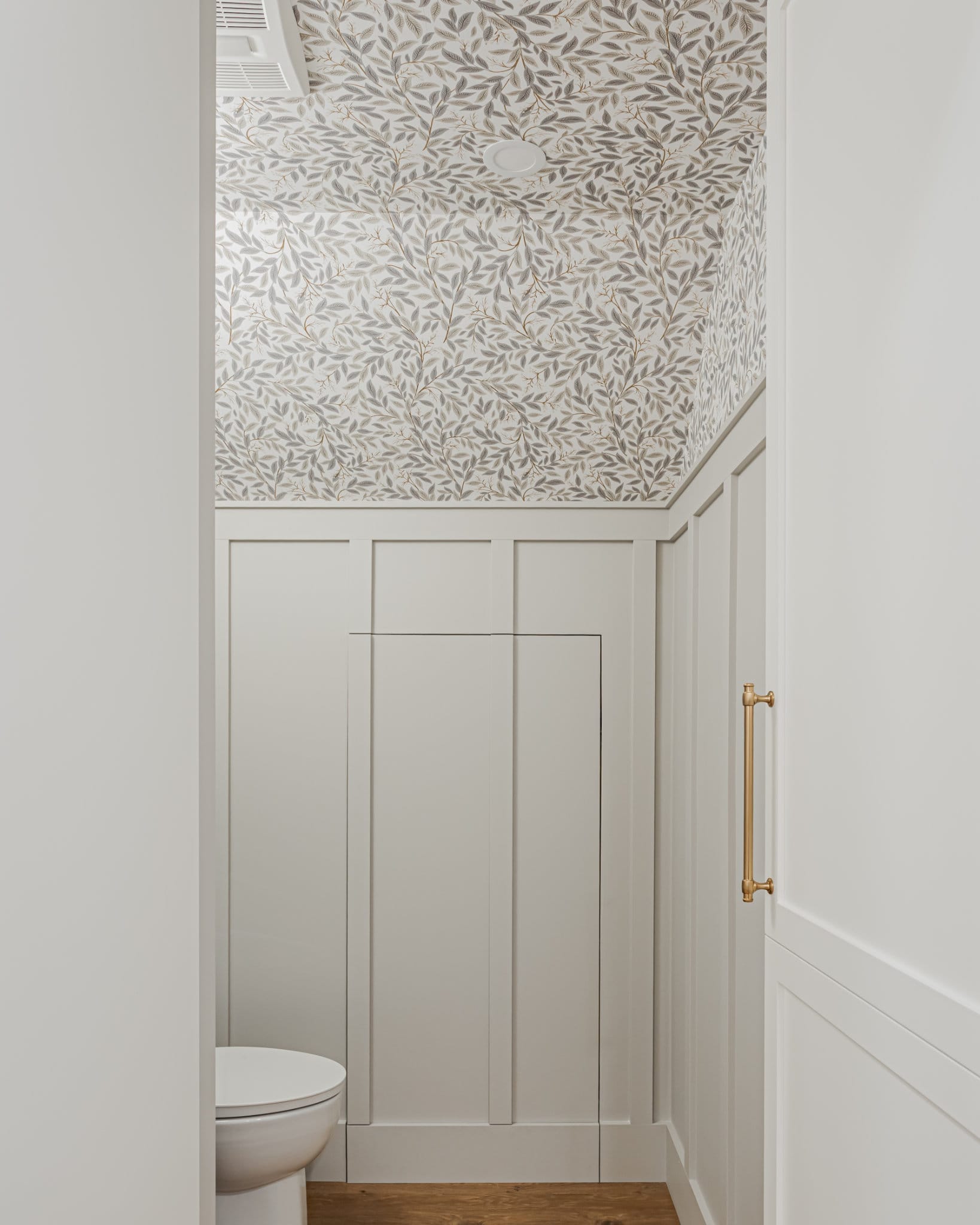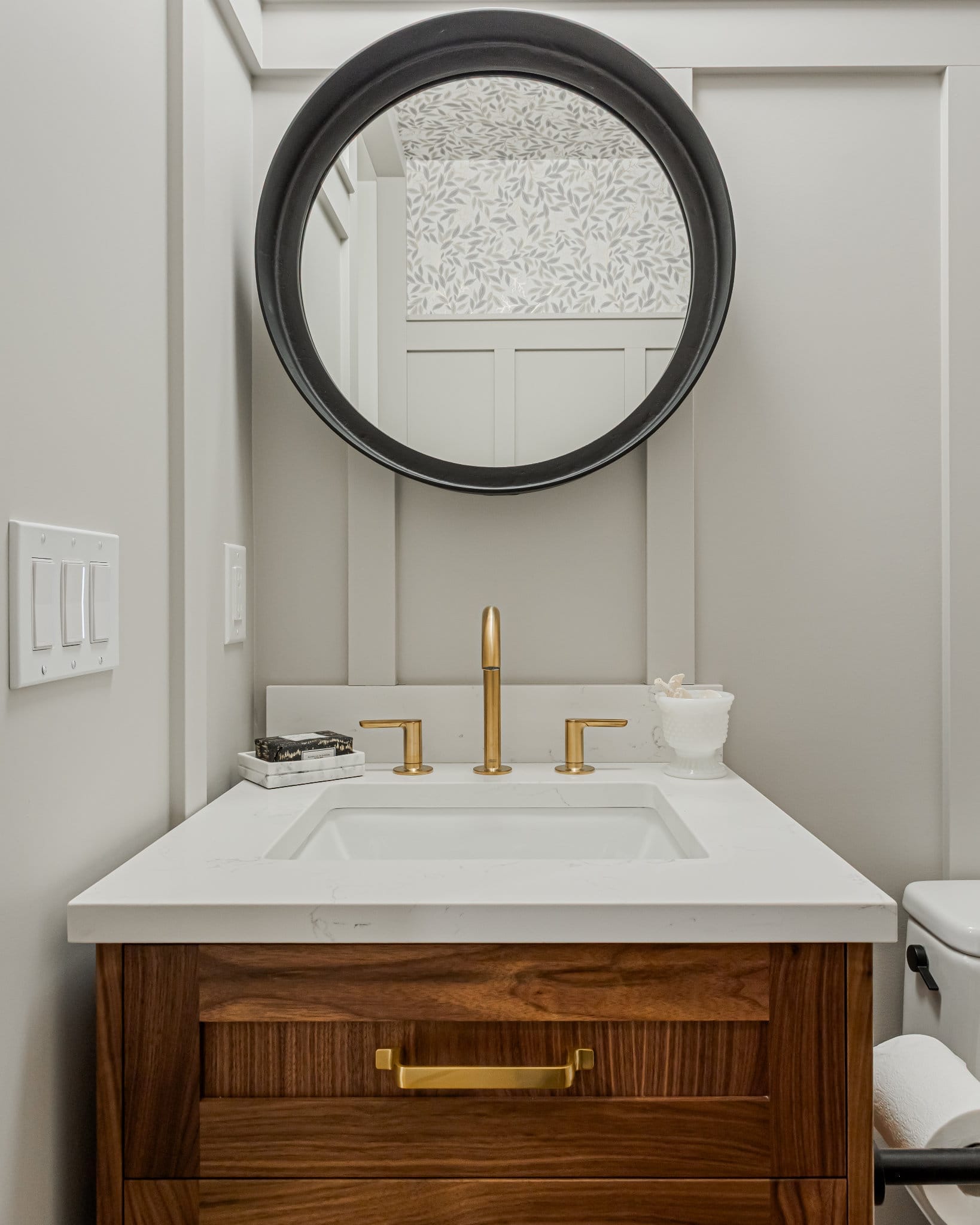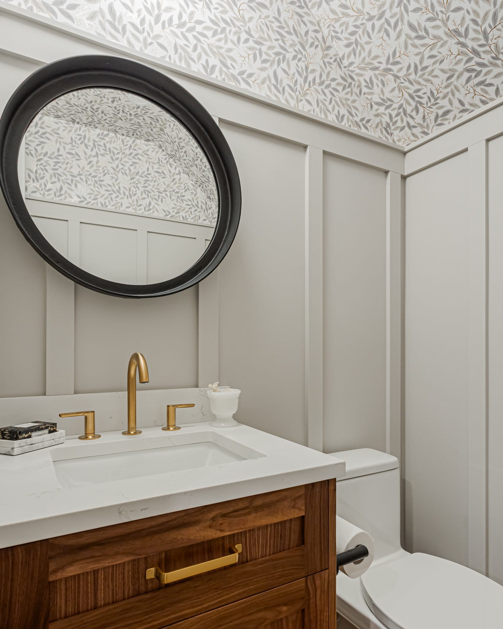 The powder bathroom was also fully renovated, featuring custom cabinetry, quartz surfaces, upgraded plumbing fixtures, and statement finishes that add personality while remaining consistent with the overall design language.